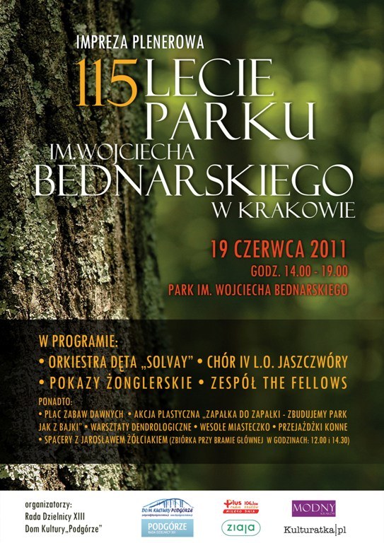 W najbliższy weekend odbędą się nie tylko IV Podgórskie Targi Rzeczy Wyjątkowych, ale także świętowanie 115 rocznicy założenia Parku im. Wojciecha Bednarskiego. Na imprezę plenerową z tej okazji w najbliższą niedzielę (19.06) w godz. 14.00-19.00 zaprasza Rada Dzielnicy XIII oraz Dom Kultury Podgórze. W programie między innymi: orkiestra dęta „Solvay”, chór IV L.O. Jaszczwóry, pokazy żonglerskie, zespół The Fellows oraz spaceru po Parku z Jarosławem Żółciakiem o godz. 12.00 i 14.30 (zbiórka przed bramą główną). Ponadto: plac zabaw dawnych, wesołe miasteczko i wiele innych atrakcji. Więcej o Parku Bednarskiego tu.