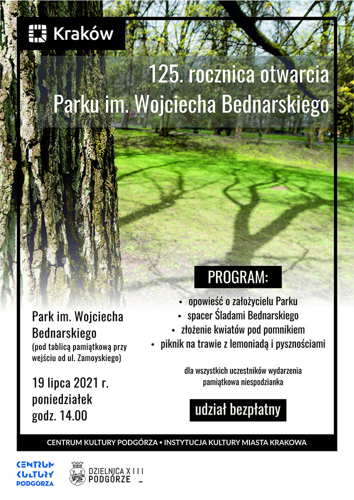 Centrum Kultury Podgórza i Rada Dzielnicy XIII zaprasza na obchody 125. rocznicy otwarcia Parku im. Wojciecha Bednarskiego. W najbliższy poniedziałek, 19 lipca będzie można posłuchać opowieści o założycielu parku oraz wybrać się na spacer śladami Bednarskiego. Zaplanowano także złożenie kwiatów pod pomnikiem oraz piknik na trawie z lemoniadą i pysznościami. A na dodatek dla wszystkich uczestników wydarzenia przewidziano pamiątkową niespodziankę.