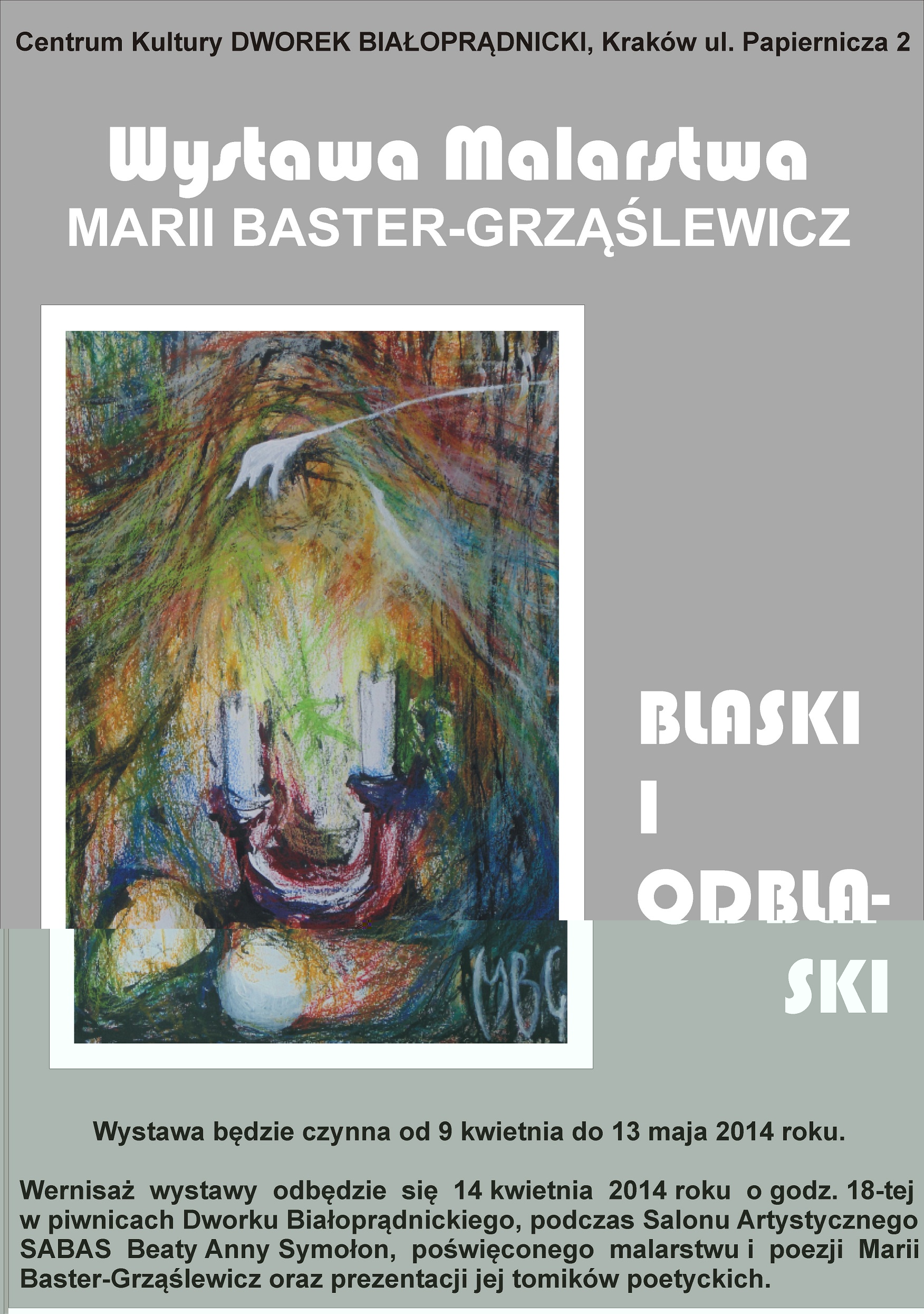 14 kwietnia o godz. 18.00 odbędzie sie kolejny Salon B.A. Symołon, którego gościem będzie podgórska poetka i malarka Maria Baster-Grząślewicz. Na poniedziałkowy wieczór została zaplanowana promocja tomów poetyckich O srebrnych kolorach i Traktat odziurze oraz wernisaż wystawy prac plastycznych Blaski i od-blaski (piwnice Dworku Białoprądnickiego, ul. Papiernicza 2).