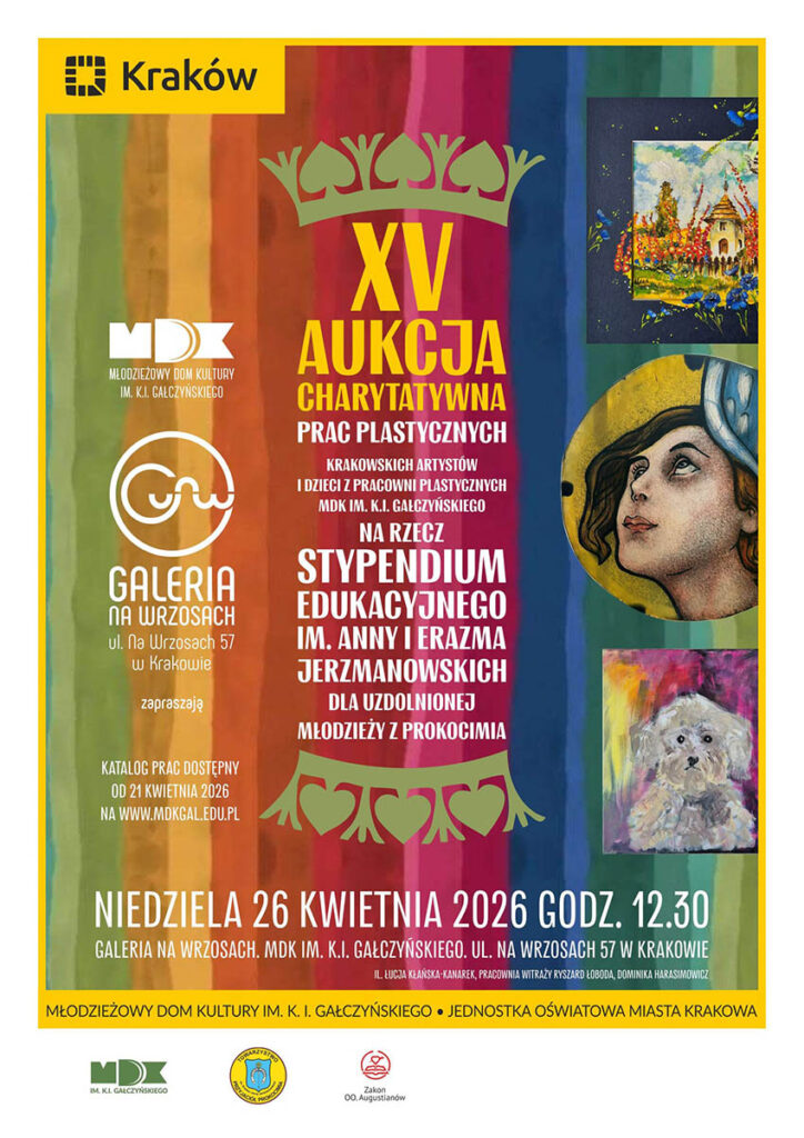 Galeria Młodzieżowego Domu Kultury im. K. I. Gałczyńskiego (ul. Na Wrzosach 57) zaprasza niedzielę, 26 kwietnia o godzinie 12. 30 na aukcja charytatywna na rzecz Stypendium Edukacyjnego im. Anny i Erazma Jerzmanowskich dla uzdolnionej młodzieży z Prokocimia. Prace na aukcję ofiarowali: Aleksander Miszalski – Prezydent Miasta Krakowa, artyści: Grażyna Domańska, Wiesław Domański, prof. Stefan Dousa, Łucja Kłańska- Kanarek, prof. Wincenty Kućma, Iza Kierska, Meggie PIU, Michalina Nikiel, Wojciech Pająk, Małgorzata Swolkień, Anna Maria Szpecht, Józef Szwanc, Wojciech Węgrzyński, Pracownie Witraży: Krakowski Zakład Witrażów S. G. Żeleński, Pracownia Zbigniewa Gustaba, Pracownia Ryszarda Łobody, Pracownia Testor. Fundacja ,,Dzielmy się uśmiechem” ofiarowała piłkę nożną z autografem Jakuba Błaszczykowskiego oraz koszulkę KGHM Polska Miedź z podpisami drużyny.