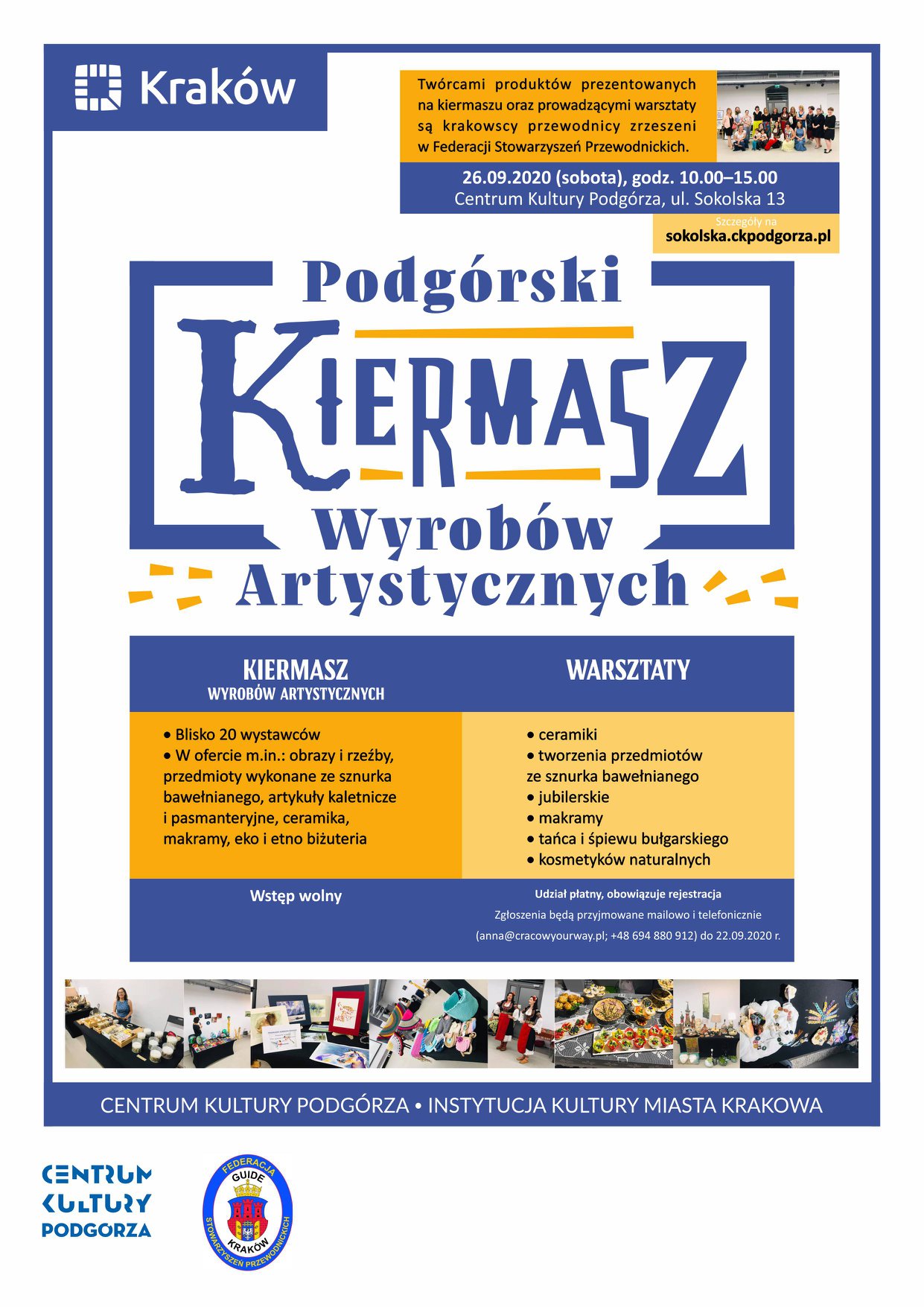 Zapraszamy na wydarzenie towarzyszące XIX PDOD – Podgórski kiermasz wyrobów artystycznych czyli kuźnię talentów przewodnickich. W Centrum Kultury Podgórza (ul. Sokolska 13) w sobotę (26.09) w godz. 10.00 – 15.00 odbędzie się kiermasz rękodzieła artystycznego, wytwarzanego przez przewodników miejskich z naszego grodu, które powstało w okresie zamknięcia z powodu pandemii covid-19. Profesjonalni, licencjonowani przewodnicy z Federacji Stowarzyszeń Przewodnickich podzielą się swoimi pasjami i hobby. Będzie można nabyć: malarstwo olejne, malarstwo pastelowe, akwarele, produkty ze sznurka bawełnianego, torebki, chusty robione na szydełku, produkty z ceramiki, produkty ze skóry, kaletnicze i pasmanteryjne, biżuterię eko i etnodesign, biżuterię z kamieni szlachetnych i półszlachetnych, makramy, fotografie, dekoracyjne wyroby papiernicze, wspaniałe wyroby kulinarne i wiele innych. Kiermaszowi będą towarzyszyć twórcze warsztaty z różnych dziedzin.
