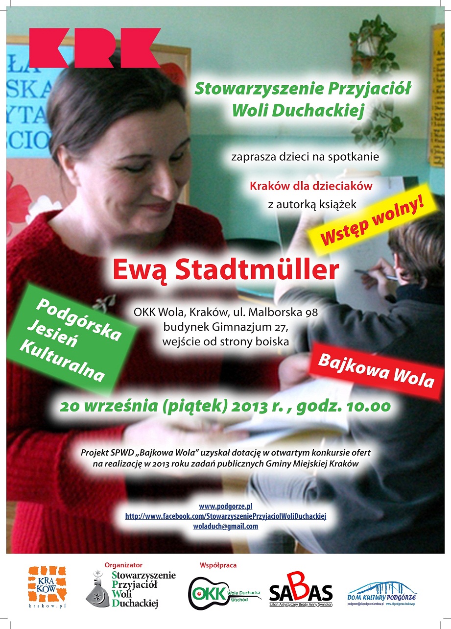 20 września br. o godz. 10.00 w Osiedlowym Klubie Kultury Wola Duchacka Wschód (ul. Malborska 98) odbędzie się pierwsze spotkanie z cyklu „Bajkowa Wola”. Nowy cykl spotkań z autorami książek dla dzieci zainauguruje Ewa Stadmuller, mieszkanka pobliskiego Kurdwanowa. Organizatorami cyklu „Bajkowa Wola” jest Stowarzyszenie Przyjaciół Woli Duchackiej, a sfinansowała go Gmina Miejska Kraków.