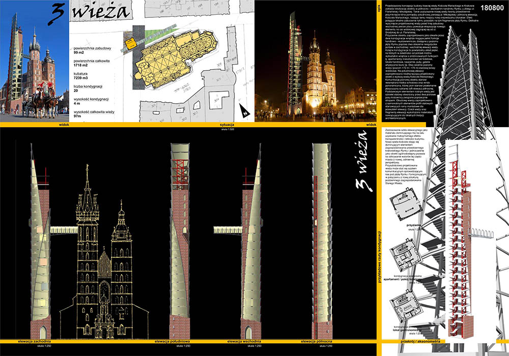 W przypływie desperacji i bezsilności Stowarzyszenie PODGORZE.PL posłużyło się nawet prowokacją, ogłaszając konkurs na opracowanie ideowo-studialnej koncepcji architektoniczno-urbanistycznej Trzeciej Wieży Kościoła Mariackiego. Chcieliśmy tym samym wyrazić oburzenie i pokazać absurdalność pomysłu, bo skoro można nadbudować unikalny w skali kraju fort, to czemu nie „uatrakcyjnić” Kościoła Mariackiego dodatkową „trzecią wieżą” wprowadzając nowe funkcje na miarę XXI wieku? Akcja ta spotkała się z odzewem z całej Polski. Napłynęło kilka interesujących projektów, na szczęście nikt na poważnie nie myślał o ich realizacji. Poniżej jeden z nich.