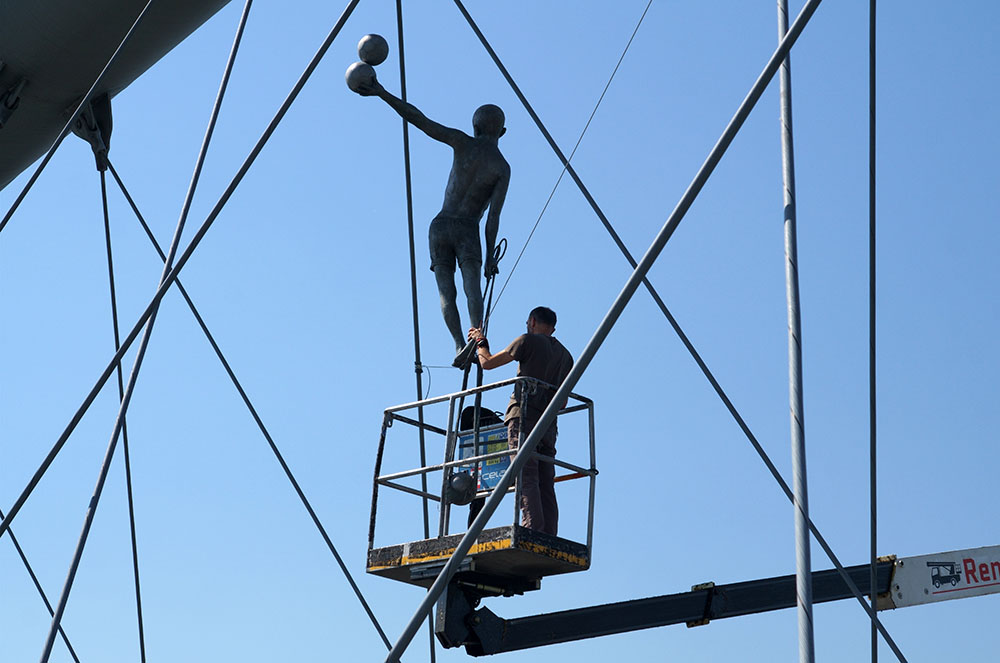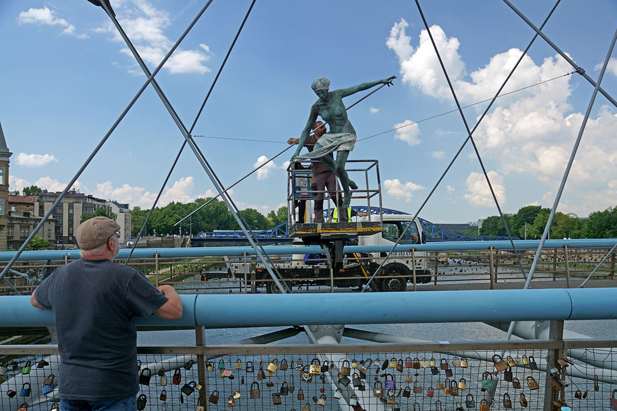 Pod czujnym okiem autora, w piątkowe przedpołudnie kolejne trzy rzeźby Jerzego Kędziory zostały zawieszone na kładce o. Bernatka. Wymagało to również innego rozmieszczenia czterech rzeźb, które zostały zakupione przez miasto i jesienią ubiegłego roku, po trzytygodniowej konserwacji powróciły na kładkę.