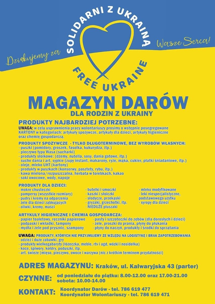 Przy ul. Kalwaryjskiej 43 powstał „Magazyn darów” czyli sklep za 0 złotych, gdzie uchodźcy mogą się bezpłatnie zaopatrzyć w artykuły pierwszej potrzeby. Jest to możliwe dzięki ofiarności mieszkańców, którzy przekazują potrzebne produkty. Przyjmowane są produkty żywnościowe długoterminowe (bez wyrobów własnych), m.in. konserwy, oleje, mleko UHT, dżemy, dania gotowe, pieczywo typu Wasa, sucharki, kawa mielona lub rozpuszczalna, herbata w torebkach, kakao, płatki śniadaniowe, makarony. Można również przynosić produkty dla dzieci, artykuły higieniczne i chemię gospodarczą (np. pasty i szczoteczki do zębów, podpaski, proszki do prania, płyny do naczyń).