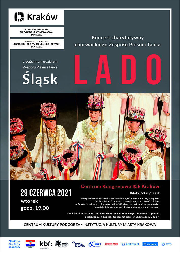 W dniu 29 czerwca o godz. 19.00 w Centrum Kongresowym ICE Kraków wystąpi Narodowy Zespół Pieśni i Tańca Chorwacji LADO. Będzie to widowisko przedstawiające bogate regionalne tradycje muzyczne i choreograficzne tego kraju. Wieczór uświetni występ jednego z najbardziej rozpoznawalnych polskich zespołów folklorystycznych Zespołu Pieśni i Tańca Śląsk. Dochód ze sprzedaży biletów zostanie przeznaczony na renowację zabytków Zagrzebia uszkodzonych podczas trzęsienia ziemi w 2020 r. w Chorwacji.