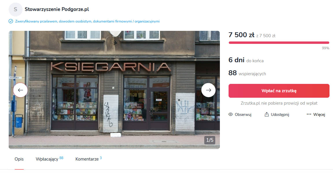 Udało się! W ciągu sześciu tygodni zebraliśmy 7500zł, kwotę potrzebną na dokończenie renowacji neonu Księgarnia, a w szczególności rekonstrukcję brakujących rurek. Dziękujemy 88 darczyńcom, którzy wsparli naszą zbiórkę, z częścią z nich spotkamy się na uroczystym włączeniu neonu w Muzeum Podgórza. Przewidywany czas potrzebny na dokończenie renowacji i montaż w Muzeum Podgórza, to dwa miesiące.