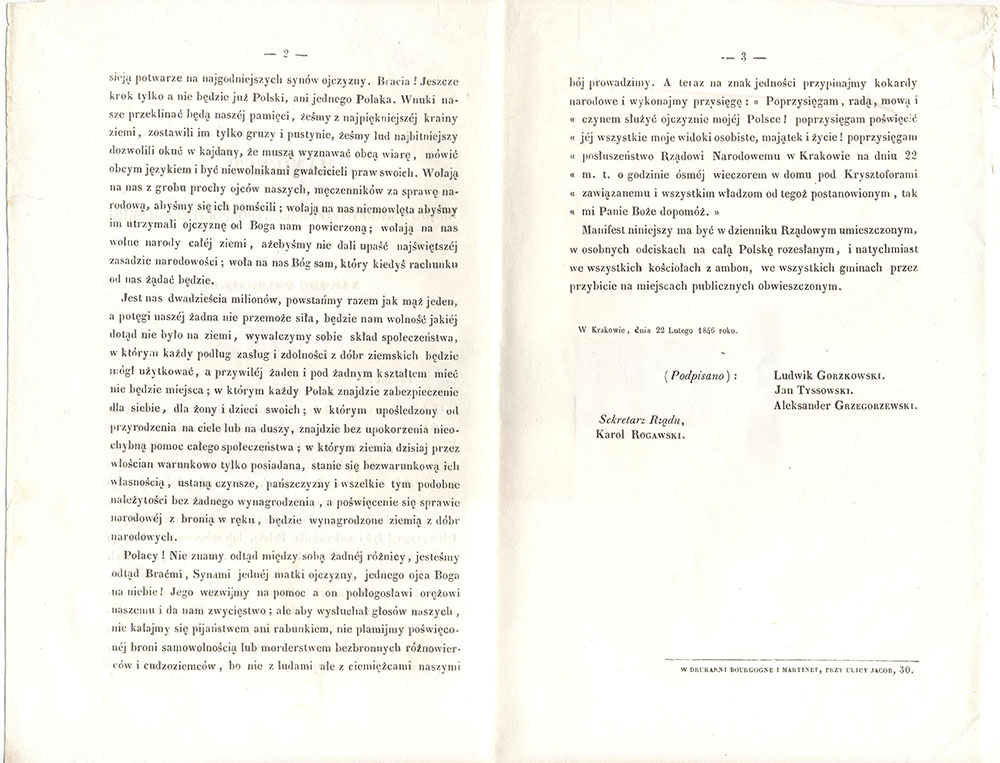 Ryc. 2 Wydany 22 lutego 1846 roku Manifest Rządu Narodowego Rzeczpospolitej Polskiej, str. 2 i 3