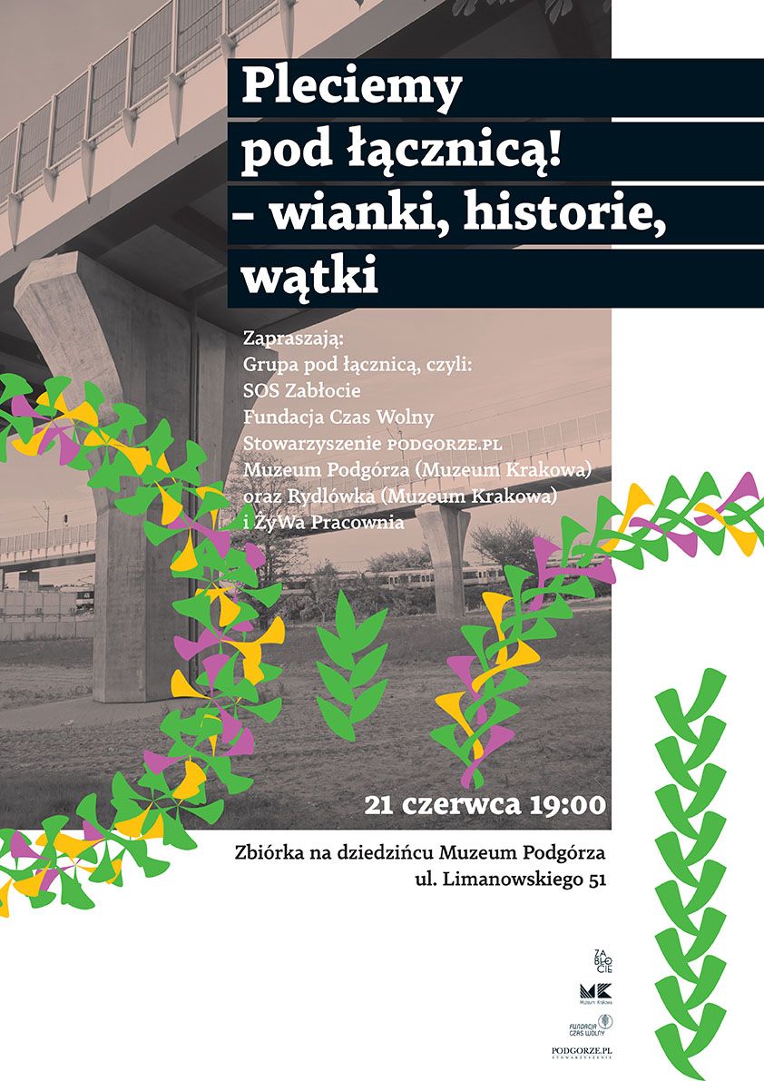 Gdy już 21 czerwca, odeśpimy poranne towarzyszenie online wschodzącemu słońcu na Kopcu Kraka, to zapraszamy wraz z Muzeum Podgórza, „Grupą pod łącznicą”, Rydlówką i ŻyWą Pracownią do Muzeum Podgórza, skąd ruszymy pod łącznicę. Tu na kilka godzin przed Nocą Sobótkową, w przyszłym parku będziemy pleść wianki, wątki historyczne związane z Kopcem Kraka, ale także z zielem magicznym. Wianki pomogą nam pleść ekspertki od młodopolskiej miłości do natury – czyli zespół Rydlówki. Z ŻyWą Pracownią wykonany instalację roślinną, być może wiankową, na pewno sobótkową. Roślin pod łącznicą jest bardzo dużo, można także przynieść własne. Na pewno warto zabrać coś na komary i coś na wypadek wieczornego chłodu. Zdecydowanie należy zabrać dobry nastrój i pozytywne nastawienie do świata ;-). Zapraszamy w imieniu Muzeum na 19.00! https://www.facebook.com/events/229534062060474?ref=newsfeed