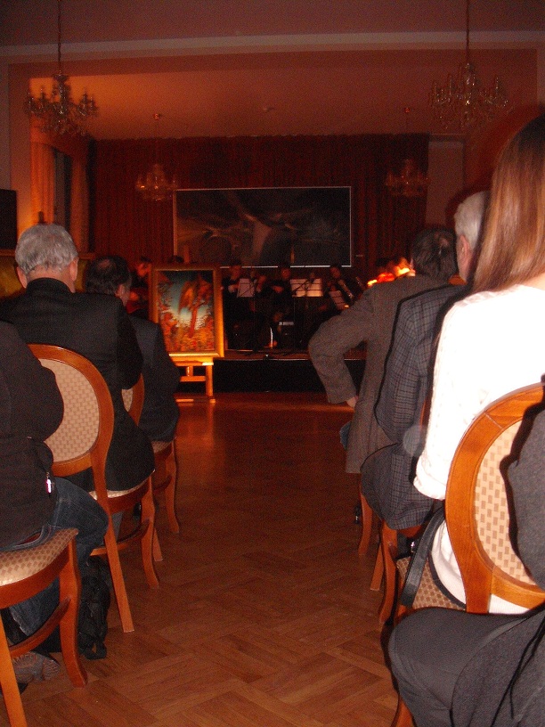 Po części koncertowej mistrz ceremonii poprowadził gości do drugiej sali z kolejnym obrazami Steca. Ale one były tylko tłem, najpierw dla słów poetyckich krakowskiego malarza. Jakub Kosiniak zaprezentował ponownie pięć wierszy, tym razem ułożonych tak, by napięcie narastało. Czy tobie też zagrażało piękno? – Pytanie skierowane w takim samym stopniu do widzów, jak i samego twórcy, a może nawet bardziej jego niespokojnie poszukującego tajemnicy uniwersalnego malarskiego przekazu. Mamo / zimno mi / mój płaszcz jest tylko z papieru / a słowa tak mocno wieją. Zawiały mocniej, jeszcze mocniej, aż do crescenda „Apokalipsy”. Puchną, puchną niebiosa, / pęka brzuch boga wezbrany, / dudnią, dudnią ciemności / cwałuje piekło wyplute z raju. Muzyka burzy narastała za naszymi plecami, wypełniał puste przestrzenie sali. Wizje nagłe cierpliwość rozpędzona / tak długo ścigała, aż zostały nagłe / i śmierć w skoku zamarła jak żywa. Burza otoczyła nas zewsząd. Aktor ukrył przed widzami twarz przepełnioną napięciem. Wybuchł pożar. Apokalipsa zaczęła się wypełniać… Wybuchały płomienie, szkielet ogromnej ryby z czasów głodu jeszcze bardziej ogromniał… Na naszych oczach rozsypała się wieża Babel. Tłum zgromadzony pod jesiennym drzewem kłębił się bezładnie…. Obrazu grozy dopełniły czarne ptaki opuszczające w różnych kierunkach obraz „Patmos II”. Jakub Zielina okazał się mistrzem animacji.
