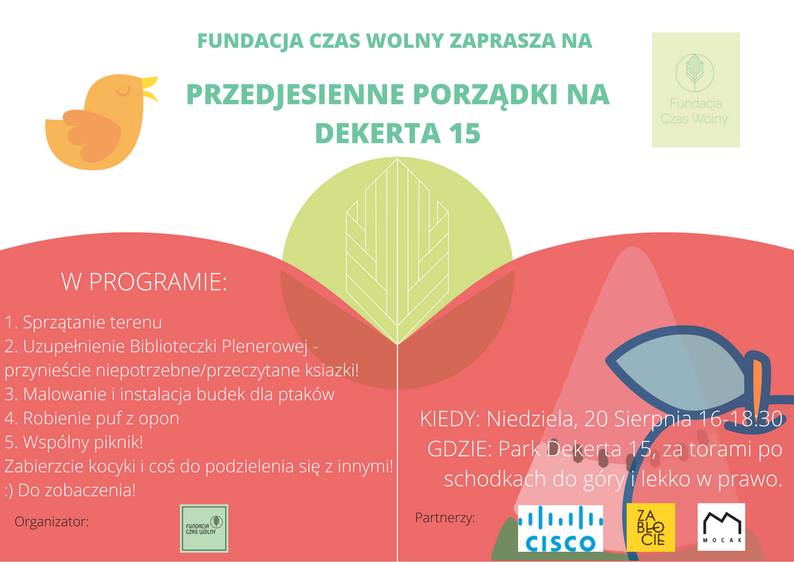 Fundacja Czas Wolny zaprasza w najbliższą niedzielę (20.08.2017) do wspólnego porządkowania parku przy Dekerta 15. Start o godz. 16:00. Organizatorzy zachęcają do zabrania ze sobą kocyków i czegoś do podzielenia się z innymi.