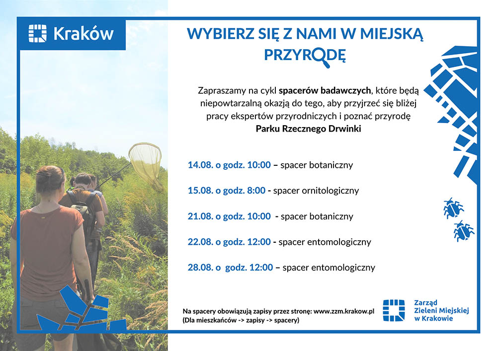 Zarząd Zieleni Miejskiej zaprasza na cykl spacerów badawczych w Parku Rzecznym Drwinka realizowanych w ramach projektu Budżetu Obywatelskiego pn. „Park Rzeczny Drwinka – ścieżka edukacyjna”
