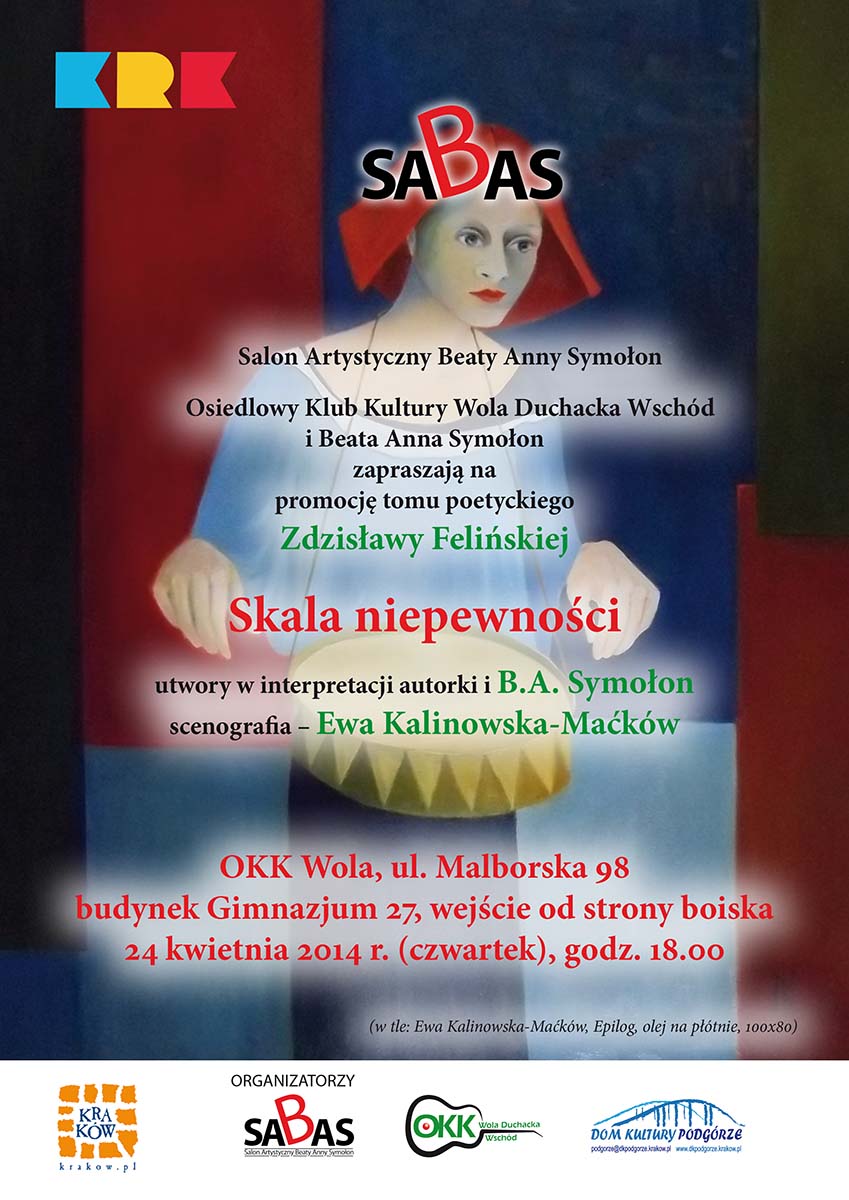 24 kwietnia (czwartek) o godz. 18.00 Osiedlowy Klub Kultury Wola Duchacka Wschód zaprasza na promocję 6. tomu poetyckiego Zdzisławy Felińskiej „Skala niepokoju”. Spotkaniu poetyckiemu będzie towarzyszła prezentacja obrazu Ewy Kalinowskiej-Maćków „Epilog”, który znalazł się na okładce książki.