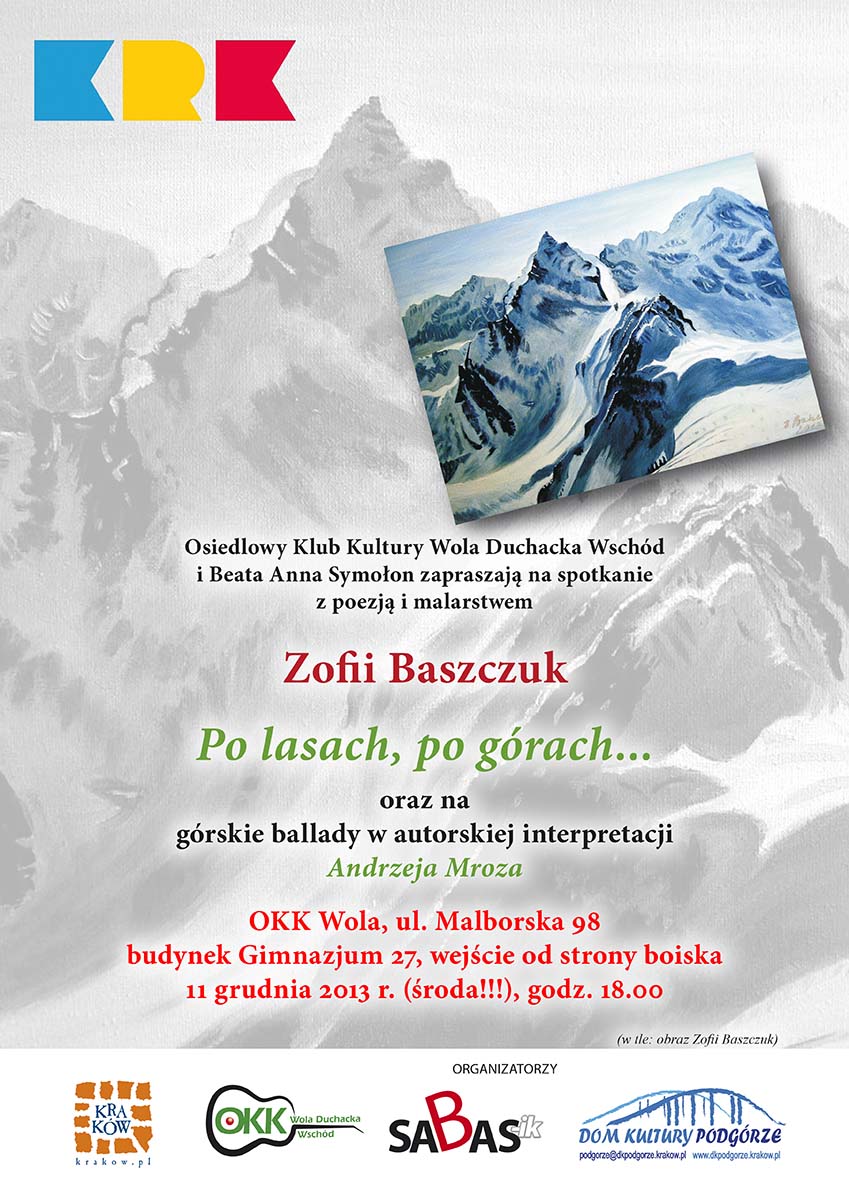 11 grudnia br., w środę, o godz, 18.00 w Osiedlowym Klubie Kultury Wola Duchacka Wschód (ul. Malborska 98) odbędzie się spotkanie z Zofią Baszczuk – poetką i malarką. Tematem przewodnim będą wiersze i obrazy ukazujące piękno natury… To już 60. spotkanie SABAS-owe.