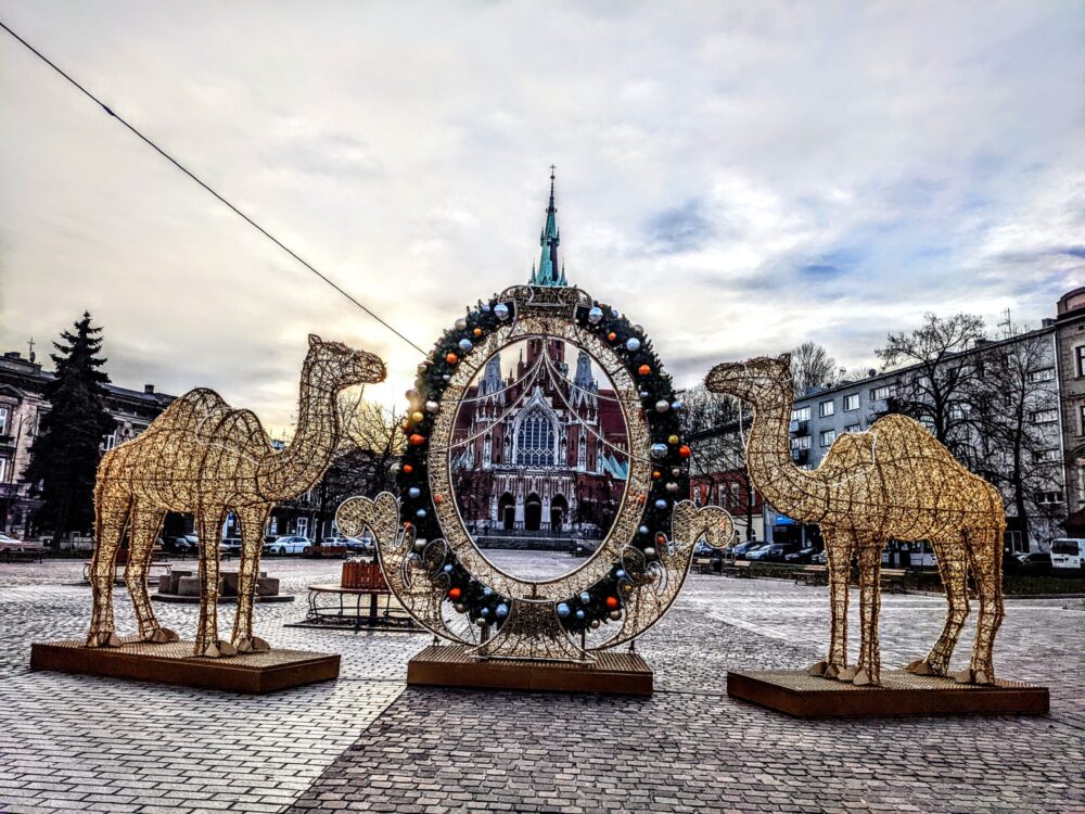 Rynek Podgórski został już ozdobiony świątecznymi dekoracjami. Stanęła choinka, znalazły się tam również… wielbłądy.