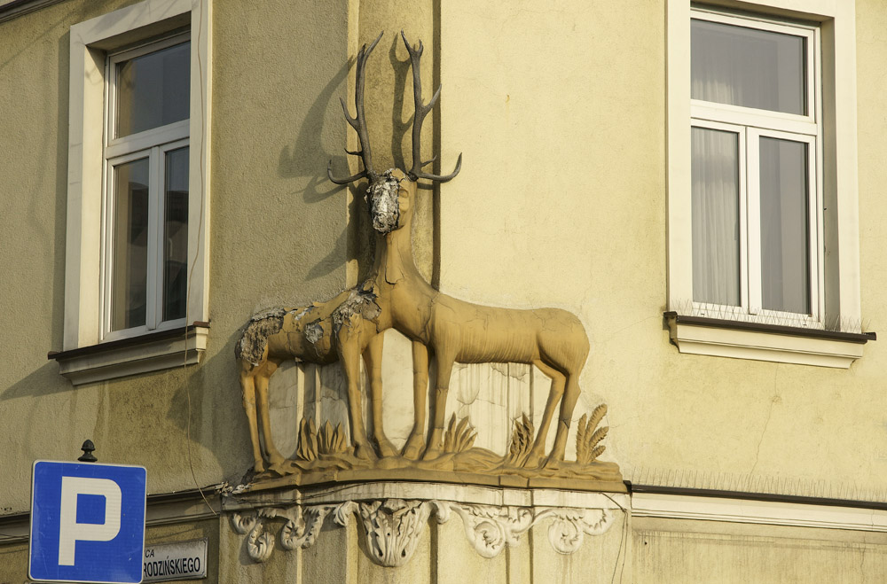 Jeleń – jeden z symboli Podgórza, charakterystyczna płaskorzeźba zdobiąca kamienicę na rogu ul. Brodzińskiego i Rynku Podgórskiego umiera, znika, pochłania ją czas i krakowskie powietrze.