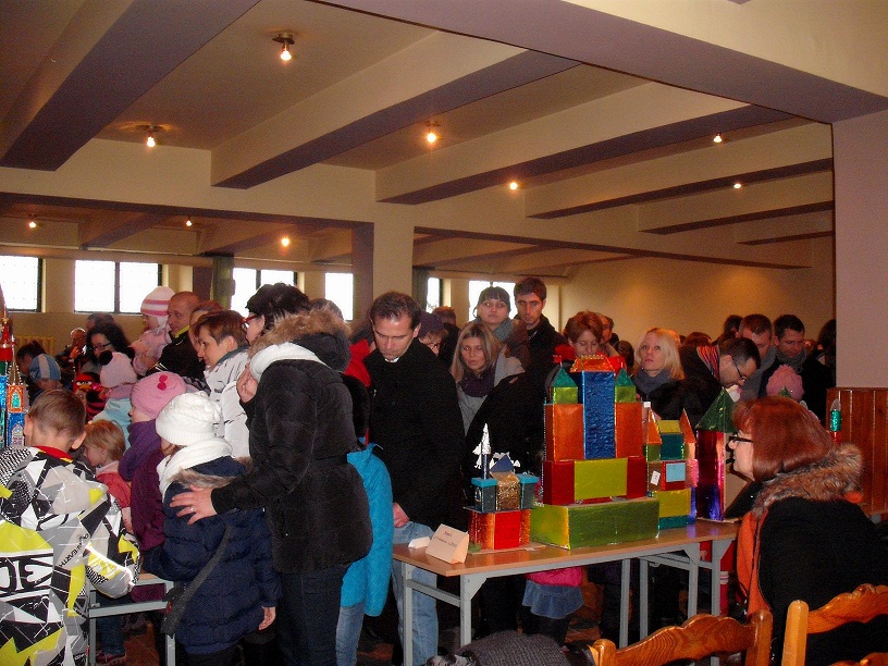 zmiana planów wystawienniczych – szopki postawiliśmy już z proboszczem Gzellą w kościele na parapetach, idąc od tyłu najpierw szopki z ubiegłorocznego konkursu, bliżej ołtarza – z tego roku