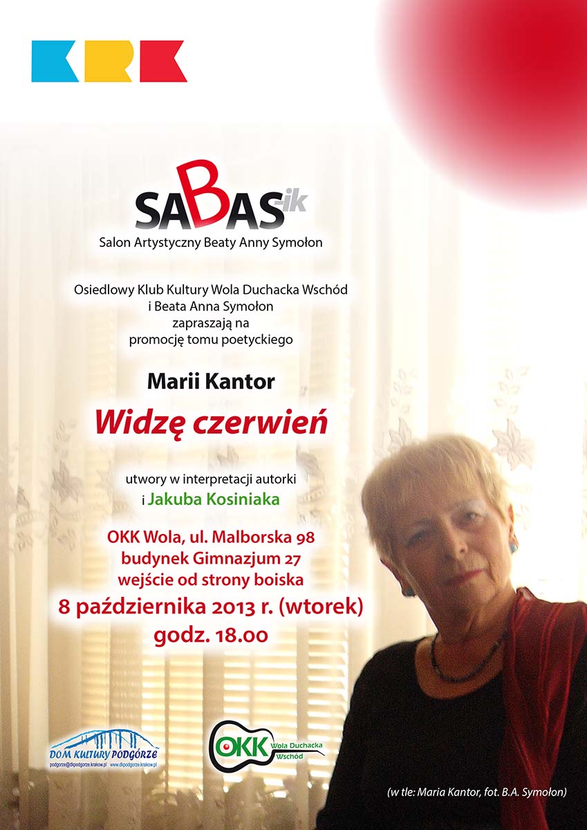 8 października br. o godz. 18.00 w Osiedlowym Klubie Kultury Wola Duchacka Wschód rozpocznie się promocja najnowszego tomu znanej krakowskiej poetyki Marii Kantor. Wybrane wiersze z książki „Widzę czerwień” usłyszymy w autorskiej interpretacji, Jakuba Kosiniaka, Zofii Baszczuk oraz piszącej te słowa. Oprawę muzyczną, utrzymaną w klimatach bałkańskich klimatach , przygotowuje Max Szelęgiewicz. Taka mała płytowa premiera…