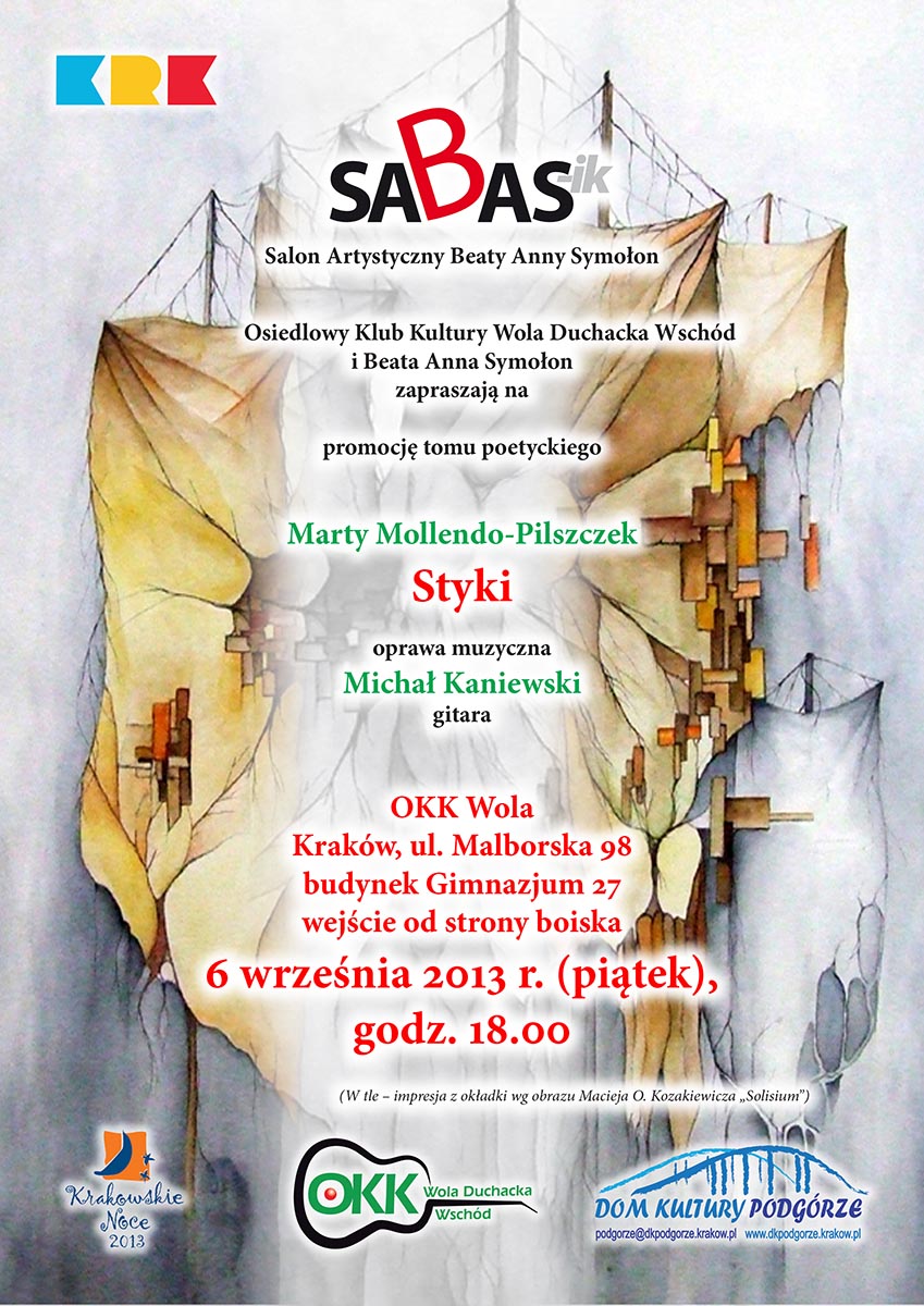 6 września (piątek), godz. 18.00 – Krakowska Noc Poezji 2013 – Salonik B.A. Symołon – promocja tomu Marty Mollendo-Pilszczek Styki, oprawa muzyczna Michał Kaniewski