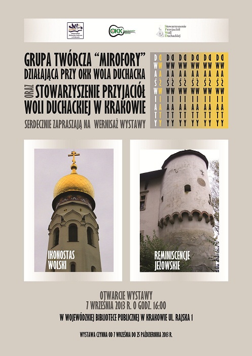 7 września (sobota), godz. 16.00 WBP, ul. Rajska 1 – otwarcie wystawy Dwa światy. Ikonostas Wolski. Reminiscencje Jeżowskie, kurator Lidia Mucha, Grupa Twórcza „Mirofory” i SPWD