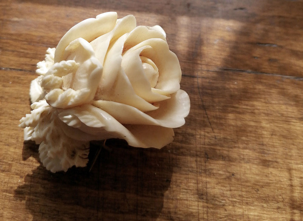 1. Róża z kości słoniowej. Służy jako broszka spinająca pod szyją kołnierzyk (wymiary 55 x 65 mm)