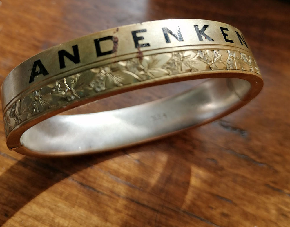 2. Bransoletka ze srebra. Dostałam ją w prezencie od Panny Janeczki. Powiedziała mi, że nie chciano przyjąć jej do sprzedaży w Desie (po wojnie) ze względu na niemiecki napis wykonany nie dającą się usunąć techniką. O ile pamiętam ten napis znaczy: na pamiątkę.