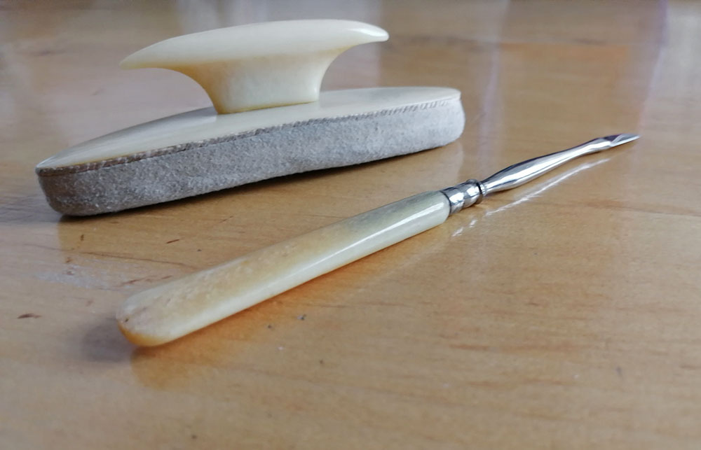 3. Część zestawu do wykonywania manicure, który mieścił się w zielonym pudełeczku. Był kompletny – nie wiem w jakich okolicznościach utraciłam większość – te które pokazuję na zdjęciu to pozostałe. A ich przeznaczenie: pierwszy to rodzaj nożyka (nie ostrego) do przesuwania skórek otaczających paznokieć – jego część dolna (uchwyt) wykonany z kości słoniowej drugi przedmiot przeznaczony jest do polerowania paznokci i składa się z uchwytu również wykonanego z kości słoniowej i zasadniczej części z irchy. (miękkiej skórki) polerującej