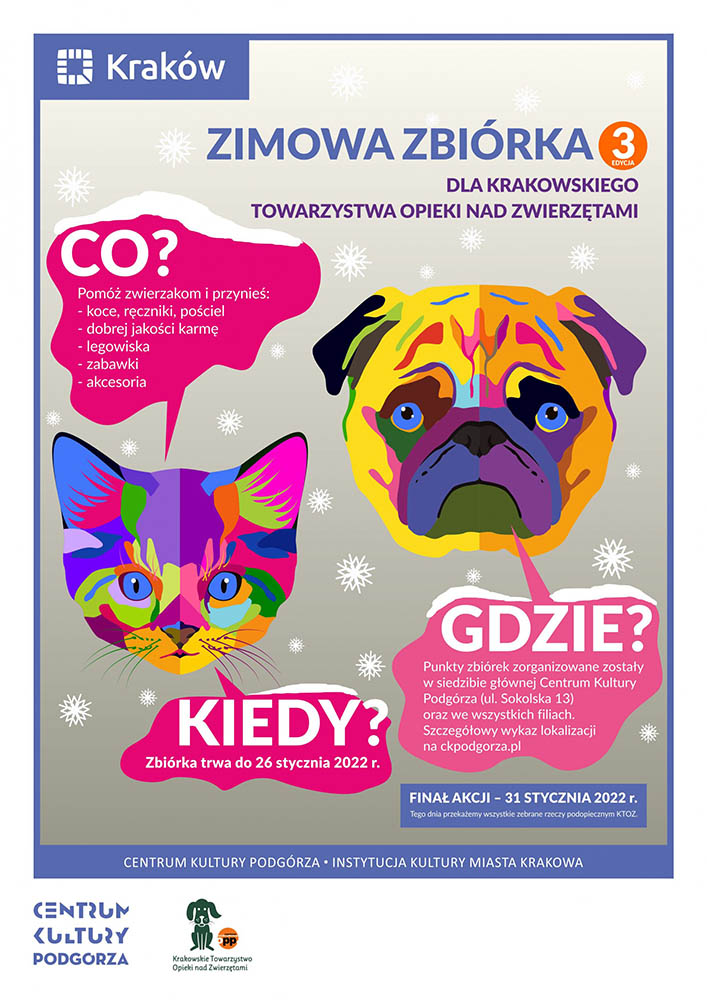 Więcej informacji: http://www.ckpodgorza.pl/o-nas/aktualnosci/sokolska/zimowa-zbiorka-na-rzecz-krakowskiego-towarzystwa-opieki-nad-zwierzetami